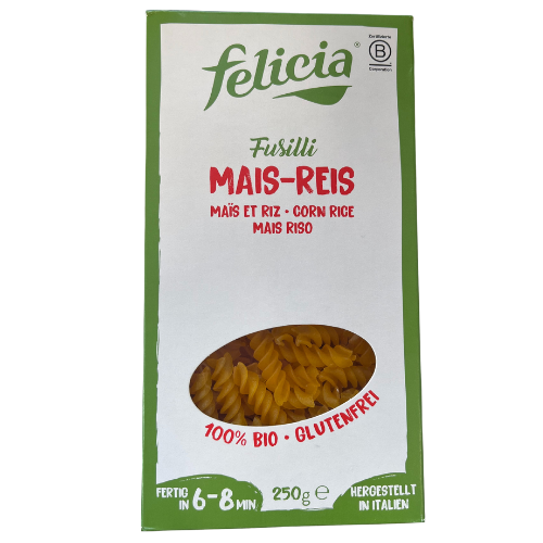 Die glutenfreien Bio Maispasta Fusilli von Felicia kombinieren den reichen und intensiven Geschmack von Mais mit dem leichten Geschmack von Reis, um ein noch schmackhafteres Produkt zu garantieren. Die neuen biologischen Mais Pasta FELICIA BIO werden aus glutenfreiem Mais und Reis aus ausgewähltem biologischen Anbau hergestellt. Die Anbaumethoden sind streng natürlich und die Rohstoffe enthalten daher keine Pestizide, Unkrautvernichtungsmittel oder andere chemische Zusätze. Das Ergebnis ist ein qualitativ hochwertiges Produkt das all seine wertvollen Eigenschaften behält und frei von Gluten und frei von Allergenen ist.
