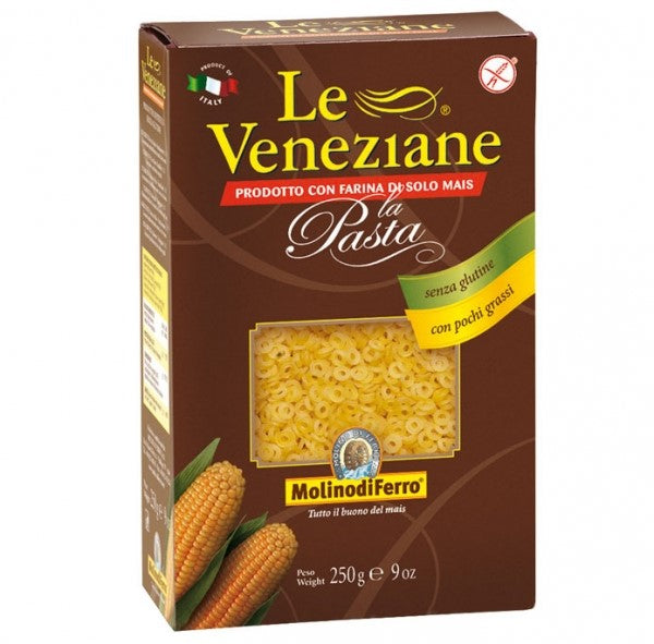 Die glutenfreien Anellini, Le Veneziane von Molino di Ferro, werden ausschließlich aus Maismehl hergestellt. Dieses unterliegt strengen Kontrollen und birgt somit keine Kontaminierungsrisiken. Die Anellini sind etwas kleinere, ringförmige und natürlich glutenfreie Suppennudeln.